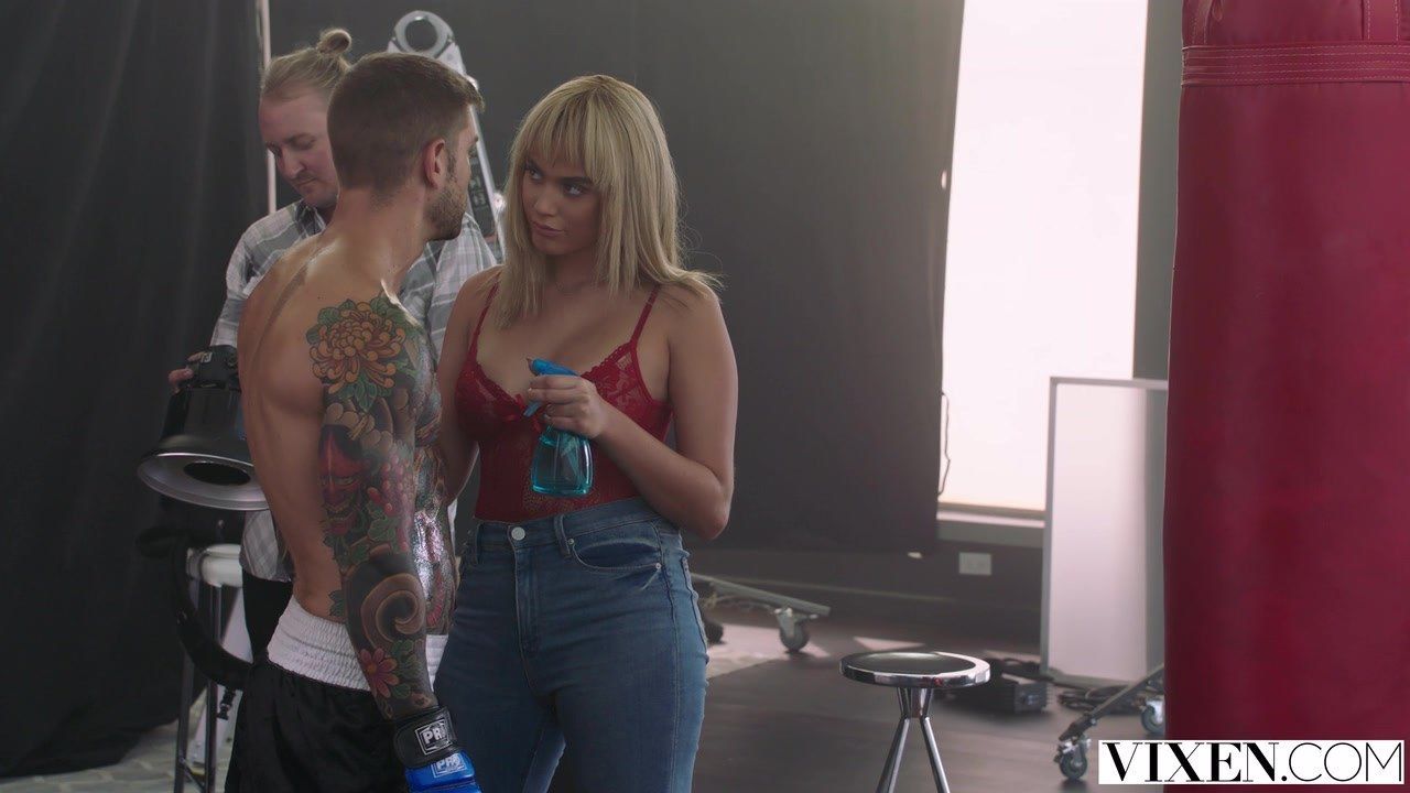 Молоденькая девушка работала ассистенткой известного фотографа и всегда была на позитиве, готовая к новым ощущениям. Во время фотосессии с бойцом ММА, она восхитилась его спортивным телом, потеряла голову и захотела заняться с ним сексом. Грудастая блондинка уличила момент, когда крепыш пошел принимать душ и голышом стоял под потоками тёплой воды. Тоже разделась, без приглашения зашла в кабинку и начала ласкаться с приятным молодым человеком. А когда у чувака приподнялся член, девушка стала перед ним на колени, откатила головку члена и принялась делать глубокий минет. Продолжила отсасывать в кровати и там же получила ответный куни, от которого её пилотка резко увлажнилась. Парень затащил милашку на себя верхом и начал долбить её дырку в позе наездницы снизу. Потом нагнул блондинку рачком и проник ей во влагалище сзади. Продолжил порку стоя, задирая ляжку девушки кверху рукой, а потом мастурбируя у милашки перед лицом, кончил на лицо и язык.