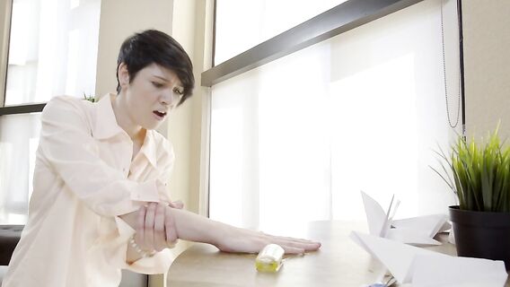 Парень работал дома над проектом в институт, но отвлекся на просмотр порнухи в телефоне и случайно пролил на стол клей. И пока клей сох, он решил уединиться у себя в спальне и снять напряжение рукой. Но кончить парень не успел. Он услышал крики о помощи своей сводной сестры, которая приклеилась к столу и не могла оторвать руки. Лучшей ситуации и не придумать. Парень даже и не думал помогать сестре освободиться, вместо этого он воспользовался ситуацией. Пошлепал ее по булочкам и раздвинул их в стороны. В это время член уже дымился от напряжения, готовый проникнуть в узенькую девичью плоть. Сводный брат трахнул приклеившуюся сестру сзади и кончил в дырку. Потом освободил ее от клея, отвел в спальню и потребовал отблагодарить, после того, как вынул сперму пальцами. Дал отсосать большой член и брюнеточка сама вылизала брату большие яйца. Раздвинула ножки, и он трахнул ее сверху. После чего вынул и кончил горячей спермой прямо на сиськи.