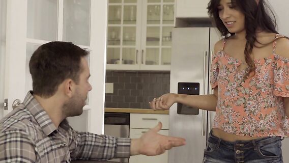 Отчиму сильно не нравится, как ходит по дому его падчерица. Девушка носит слишком короткую одежду и мужик решает заняться ее воспитанием, чтобы показать, как поступают с такими сучками настоящие мужчины. Укладывает к себе животом на ноги и начинает хлёстко бить ладошкой по булочкам. Стаскивает на пол, нагло расстёгивает ширинку прямо перед лицом и заставляет отсасывать, но без лишнего шума, чтобы не привлечь внимание матери, за спиной у которой всё происходит. От шикарного отсоса мужик вообще теряет голову, и не хочет ограничиваться одним минетом. Быстро нагибает молоденькую брюнеточку в позу раком на диване и начинает долбить в дырку сзади. Но неожиданно входит сын, и отец говорит ему заткнуться и присоединиться к сексу. Парень становится у девушки перед лицом и даёт ей в ротик, тогда как отец чпокает милашку сзади. Дальше отец с сыном начинают вертеть девушку между собой, меняясь дырками и меняя позы. Затем ставят на полу на колени, дрочат, и кончают на лицо и маленькие сиськи.