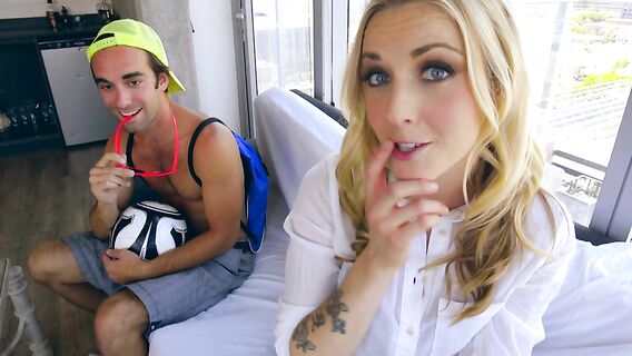 Парень весело проводил время в компании студенток, в то время, когда к нему в дом пожаловала училка, которая привезла забытые им вещи. Увидев блондинок в купальниках, телка начала их одаривать комплиментами, а после попросила примерить бикини одной из девушек. Все три красотки уединились в ванной комнате. Училка помогла девкам раздеться, и они немного побаловали друг друга оральными ласками, а после переместились в гостиную. Студент был в приятном шоке, когда увидел училку в соблазнительном нижнем белье и двоих подруг в обнаженном виде. Они устроили жаркий групповой секс и насытившись членом, девушки легли в ожидании спермы, раскрыв ротики, пока училка страстно дрочила член самца.
