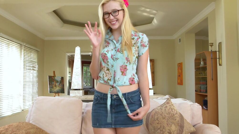 Милая блондинка в короткой юбчонке на самом деле не такая уж скромница, как может показаться с первого взгляда. Эта очаровательная телочка в очках готова полностью раздеться, чтобы показать жаркий мастер-класс всем, как нужно правильно ласкать свою пилотку. Светловолосая девка постепенно раздевается и ласкает киску сквозь белые трусики, чувствуя, как вагина становится мокрой. Разгоряченная блондинка стянула с себя трусики и принялась дрочить клитор, сидя на мягком ковре. Цыпочка мастурбирует киску и сладко стонет от удовольствия. В разных позах она вставляет свои пальчики в розовую щелку, чтобы довести себя до пика блаженства и кончить.