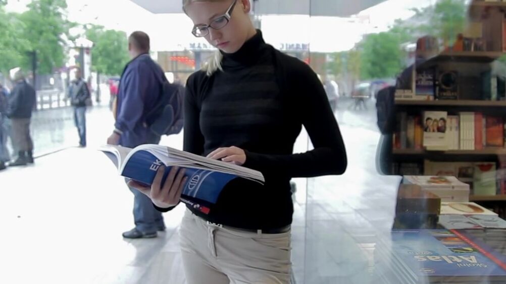Блондинка в очках для зрения приобрела новую книгу и теперь внимательно изучала ее. Парень вызвался ей помочь, так как понимал, что с этой занудой блондинкой может быть и не так скучно, окажись они в другой обстановке. Он пригласил телку к себе, якобы, чтобы вместе изучить эту интереснейшую книгу, а на самом деле он просто хотел замутить секс с новой знакомой. Оказавшись в домашней обстановке, два очкарика слились в поцелуе, а потом принялись одаривать друг друга нежными ласками. Самец сделал ей куни, а она в ответ ему минет. Парочка жарко трахалась в разных позах на кровати, кайфуя друг от друга. Довольный самец кончил, облив ее очки спермой.
