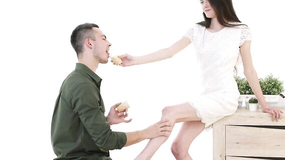 Ариана и её парень кормят друг друга мороженым, что становится потрясающей прелюдией для страстного секса. Эти оральные намёки, вскружили парню голову, и он уже не в силах остановиться. Медленно раздевая друг друга, парочка не прекращает целоваться. Когда на ней остаются только трусики, а на нём не до конца снятые брюки пара ложится на большой пуфик в позу 69 и оральные ласки погружают их в мир сексуального наслаждения. Минет и сочное куни, возбуждают их до предела, поэтому продолжение становится очень страстным и горячим. Сняв с прелестницы трусики, парень насаживает её на член, наездница плавно вбирает в себя всю его длину, начиная двигать вверх вниз. Родео сменяется на грубый трах девушки, лежащей на спине с широко разведенными ногами. А всего лишь немного повернув её на бок, парень продолжает акт анальным сексом. Готовая к этому попка легко впускает член, и наслаждение переходит на более высокий уровень. Поставив девушку раком, на полной скорости трахая её попку, парень доводит Ариану до оргазма, а следом за ней кончает сам, завершая секс камшотом.