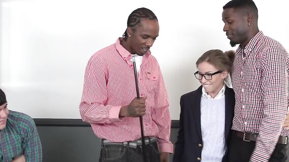 Чувак решил составить кампанию своей девушке, когда она собралась пойти поиграть в бильярд, и был сильно удивлён, когда её соперниками оказались два чернокожих паренька, с которыми она начала откровенно флиртовать. Бойфренд побоялся возразить и просто остался сидеть на стуле. А негр увлёк худую деваху за собой в другую комнату, где поставил на колени и брюнетка в очках смело взяла за щеку большой член. А когда присоединился его напарник, то теперь рот девушки обслуживал вместо одного чёрного члена сразу два. Худышка сделала двойной минет, позволила поставить себя раком, спустить трусы и проникнуть большим членом во влагалище. Со вторым членом худая девушка продолжала играть рукой и отсасывать губами. Сменила позу и, лёжа на спине, попробовала дырочкой вторую чёрную головку, кайфуя, что первый раз трахается с двумя неграми сразу. Когда факер лёг на спину, брюнеточка оседлала большой чёрный член верхом и потрахалась с негром в позе наездницы. При этом второй член она не упускала из вида и всё время сосала, чтобы он был в постоянном напряжении. Поэтому когда негры заканчивали межрассовый мжм секс, то поставили чужую девушку на колени, и один за другим слили сперму в рот.