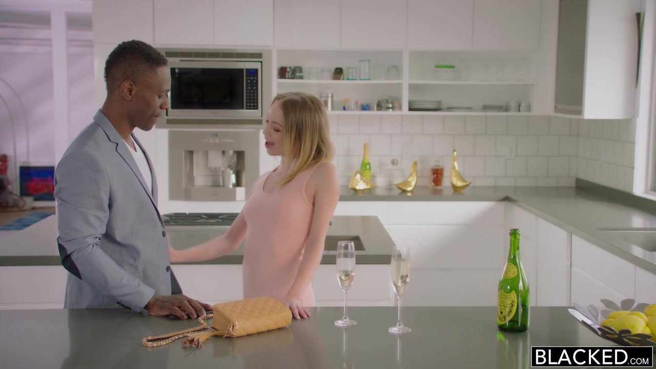 После того, как соседка потрахалась с известным негром, её подруга, молодая блондинка тоже хочет доказать парню, что является его большой поклонницей. Оказавшись в гостях у негра, девушка сразу начинает игриво себя вести. Просит угостить вином, и сама начинает целовать негра в губы. Парень принимает эротичную игру. Быстро стаскивает с маленькой блондинки платье с трусами, укладывает на кухонный стол, и принимается подлизывать её пилотку. От куни сучка резко возбуждается. Это её любимые ласки и киска быстро увлажняется. И когда наступает её очередь ласкать член негра губами, она с наслаждением делает глубокий минет. Сосёт большой хуй негра лёжа на кровати и парень быстро меняет дырку. Вынимает член изо рта и начинает вставлять его блондинке во влагалище. Напрягает все мышцы своего тела и с силой ебет девушку в пизду. Меняется местами и сучка делает приседания, стараясь садиться на член негра не до конца, чтобы трахаться без боли. Послушно слазит, становится в позу раком и парень, вынимая свой член, начинает кончать блондинке на пилотку.